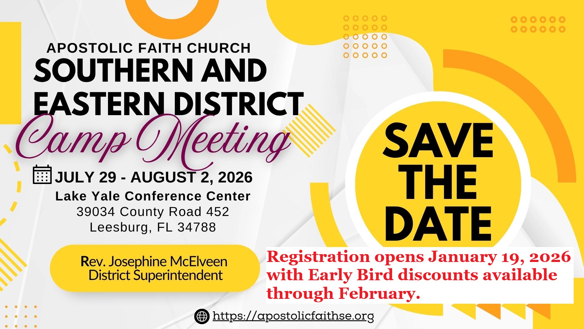 The Southern and Eastern  camp meeting is held on the campground in Century Florida. The schedule includes Bible teachings, youth services, and evangelistic meetings.